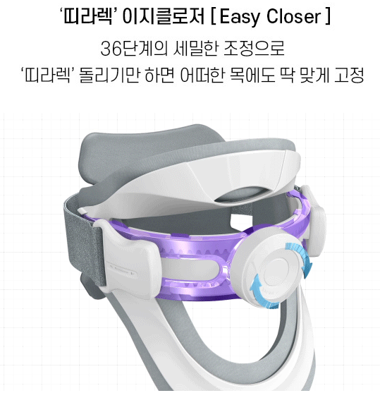 간편하게 조립이 가능하고 210그램으로 무게도 가벼운 편이라서 아이들이나 연세 있으신 어르신들까지도 쉽게 사용이 가능하면서 다들 만족해하시는 것 같았습니다. 프리사이즈라 누구나 쉽게 혼자서도 착용이 가능한 띠라렉 디닥넥 전면은 이지 클로저를 1단계~10단계까지 목둘레에 맞게 맞춰 돌리면서 머리와 등이 1자가 되게 바른 자세를 맞춰가시면 되는데요. 기어브라켓쪽은 턱이 움직이지 못하게 고정되어 있어 괜찮은 효과를 낼 수 있겠더라고요. 이 부분도 오래 사용하면 때가 타거나 지저분해질 수 있는 스펀지 패드 부분은 탈부착이 가능하고 세탁까지 가능하니까 오래도록 사용할 수 있을 것 같다는 생각이 드네요.