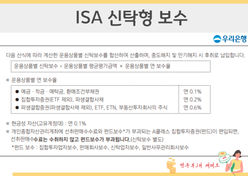 ISA계좌 개설조건 중개형 일반형 저소득형 장단점 개인종합자산관리계좌 ISA계좌 개설조건 중개형 일반형 저소득형 장단점 개인종합자산관리계좌 ‘핫’한 사람은 등장… blog.naver.com 이 글은 2월 9일에 작성되었습니다. Trust ISA Account ISA라는 장바구니가 있습니다. 장바구니는 어느 금융사에서나 1개만 생성이 가능하며, 3년이 지나면 교체해야 합니다. 이 중 은행에 가입할 수 있는 신탁형 ISA계좌가 있으며 여기서 거래할 수 있는 상품으로는 REIT, ETF, 상장수익증권, ETN, 펀드, 파생결합증권, 예금, RP 등이 있습니다. 신탁형 ISA 정기예금은 은행에 청약할 수 있는 정기예금 상품으로, 만기일은 1~3년이며, 예금형입니다. 면세혜택은 일반형 500만원, 일반형은 500만원이다. 서민 및 농촌지역 예금기간은 1,000만원이다. 예금기간은 마음대로 관리할 수 있으나, 3년 동안 계좌를 유지해야 하고, 조기 해지할 경우 15.4%의 이자세를 내야 한다는 단점이 있습니다. ISA계좌예금 금리비교 은행연합회에서 금리비교를 할 수 있지만, 안되는 상품이 더 많습니다. 전국 은행에서 ISA계좌 정기예금으로 가입할 수 있는 상품은 70여개 정도다. 목록을 찾아보았으나 각 은행에서 운영하는 상품이 몇 개밖에 없습니다. 상품이 다르기 때문에 해당 은행에 문의하시는 것이 가장 빠른 방법입니다. ISA 정기예금 계좌 개설 방법 은행을 방문하여 ISA 계좌용 입출금 계좌를 개설하세요. (특수계좌이기 때문에 계좌개설에 20일은 걸리지 않습니다.) 은행에서 판매하는 정기예금 상품에 가입하세요. (타 금융기관도 가능) 3년 동안 유지되는 우량 정기예금 상품이 있다면 연간 4천만원 한도 내에서 가입하세요. 이때, 일단 신탁형을 설정하시면 국내주식을 매매할 수 있는 투자중개상품에 투자하실 수 없으므로 신중하게 생각하시기 바랍니다. . 1차, 2차 금융기관 모두 신청하실 수 있습니다. 국민은행에서 계좌를 개설하고 상품을 NH농협으로 선택하면 0.1%~0.2%의 수수료가 부과됩니다. (수수료는 이자율에 포함되어 있습니다.) 3.6% 금리로 계약할 경우 수수료가 0.1%라면 수수료 0.1%를 제외한 실질이자율은 3.5%입니다. 신탁형 ISA계좌 정기예금 사용법 안전자산에 투자하고 싶으신 분. (특히 은퇴를 준비하시는 분들은) 2024년에는 한도가 연간 4천만으로 늘어났으니, 묶여도 괜찮다면 3년간 잘 관리하시는 것이 좋을 것 같습니다. ISA 계좌는 세금 공제 대상이 아닙니다. 다만, 비과세+저세율 세제혜택을 받은 최종금액을 만기 3년 이후 연금저축으로 전환하면 세액공제 혜택도 받을 수 있습니다. 청년도약통장에서 이체하지 않고 3년 정기예금을 찾는 이들 중 투자중개ISA가 필요없다는 이들은 금리를 비교하고 비과세 혜택도 있으니 어느 쪽이 더 유리한지 따져봐야 한다. ISA 정기예금 상품 수수료가 궁금하시다면 금융투자협회에서 제공하는 전자공시 서비스인 ISA 다모아 사이트에서 비교해 보실 수 있습니다. 해당 자료는 2023년 12월 31일 기준 가장 최근 자료입니다. 지금까지 ISA계좌 정기예금 금리 비교 및 면세계좌 개설 방법에 대해 알아봤습니다. 일정 금액의 돈이 있고 안전한 투자 방법을 선호하는 분들에게 좋은 상품인 것 같습니다. 저도 이렇게 포스팅하면서 공부하고 있어요. 설명이 부족한 부분이 있을 수 있지만, 너그럽게 읽어주시면 감사하겠습니다 ^^